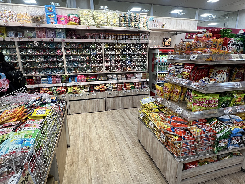 お菓子がたくさん積まれていますが、通路が広いので、選びやすい店内となっています。