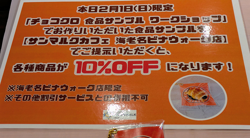 作った食品サンプルを当日「サンマルクカフェ海老名ビナウォーク店」で提示すると各商品が10%OFFなのも嬉しい。