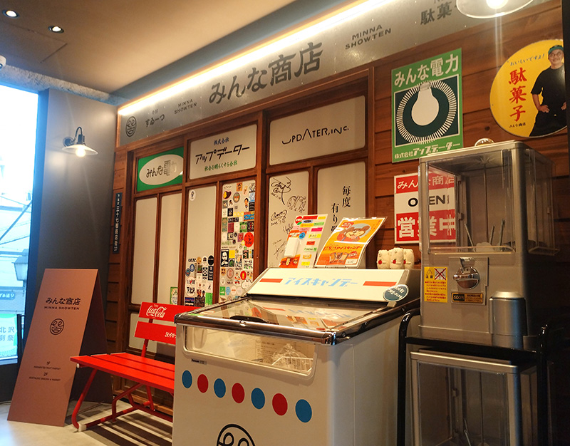 そしてエレベーターで2階に上がると、1階とは異なる光景が広がっています。目の前には、昭和30年から40年代の懐かしい風景が再現されている一画にワクワクした気持ちになります。フロアの奥には「37棚商店街」と呼ばれるエリアがあり、壁のボックスが1店舗として社会や環境に想いを持つ法人・団体・個人の商品が並んでいます。約20歩ほど歩けば37店舗を巡ることができるという独特な空間です。