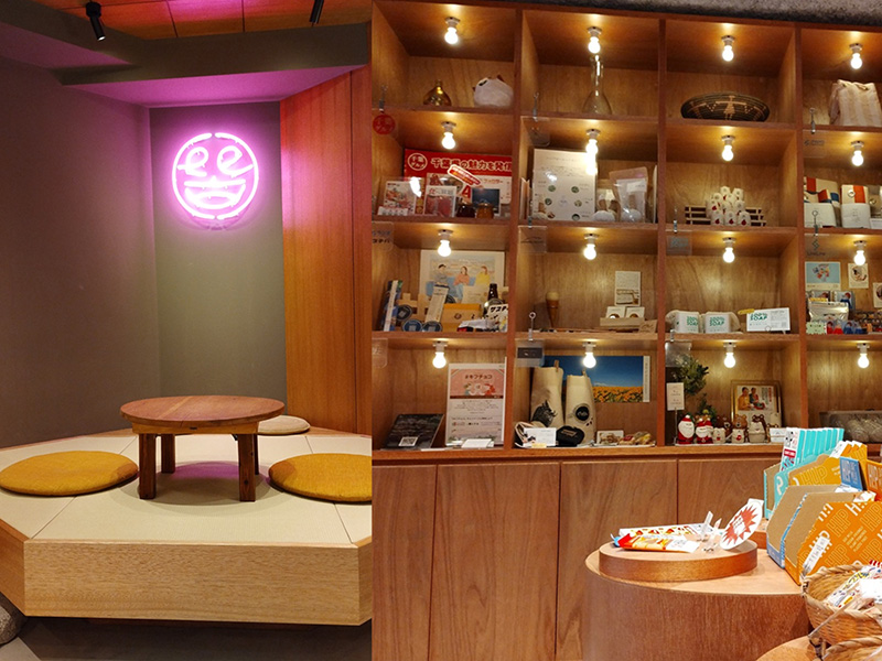 また、1階で購入したスイーツを持ってエレベーターで2階に上がると、イートインできる椅子や畳の小上がりが設置されており、買い物だけでなくその場でゆったりとスイーツや飲み物を楽しめる空間となっています。このような工夫により、単なる商店以上の「憩いの場」として機能しています。