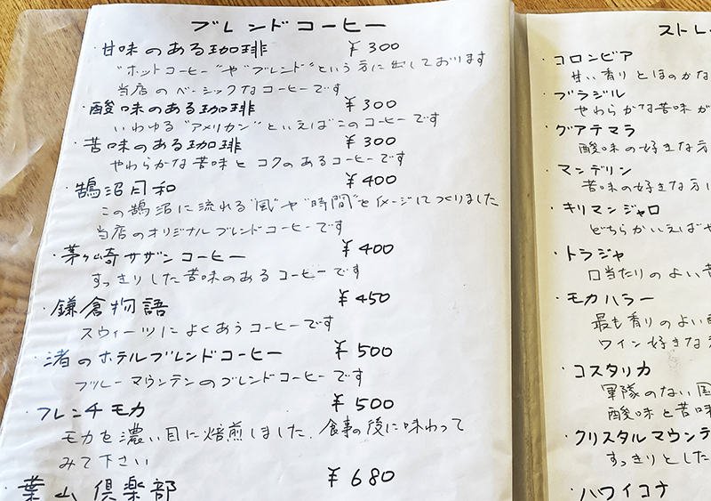 各種ストレートコーヒーとこだわりのブレンドの並ぶメニュー。「甘みのある珈琲」「酸味のある珈琲」など、珈琲初心者にも選びやすい心遣いがうれしい。「鵠沼日和」「鎌倉物語」など次回に頼んでみよう。というか、お安くないですか?あらうれしい!